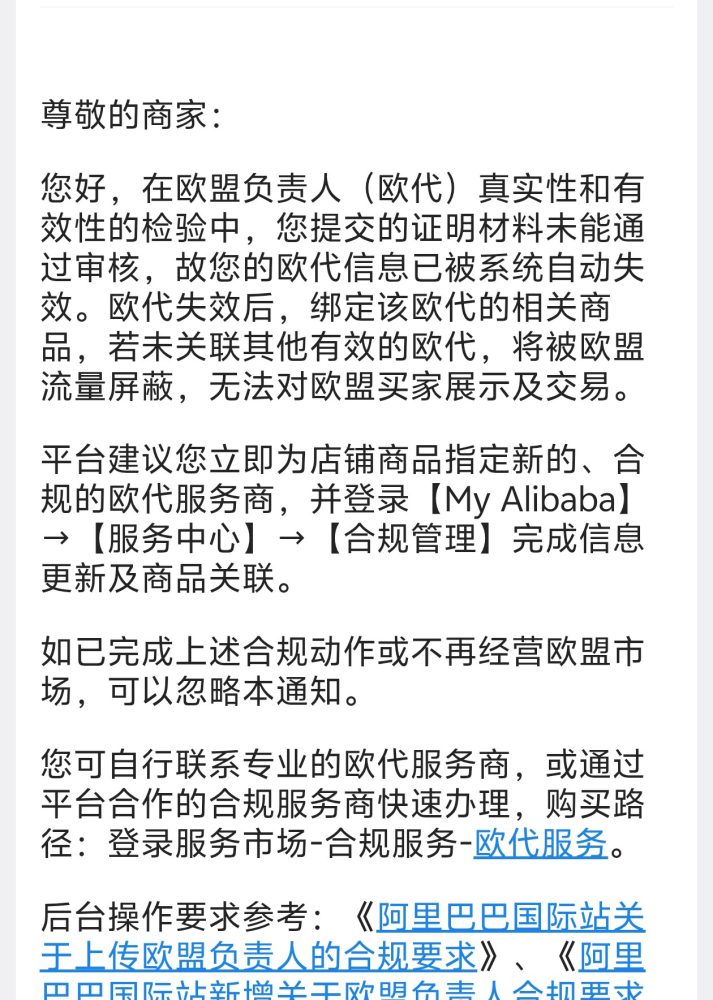 这封阿里的站内信,本质是一封“恐吓式开发信”,站内信用“春秋笔法”,刻意写的非常模糊,没有指定具体是那个欧代失效,还选择了特殊时机推送给商家,实际就是在恐吓商家、误导商家。让商家以为在其他渠道办理的欧代失效了!实际上是阿里国际站自己的欧代失效了(因为商家没跟阿里续费!)
